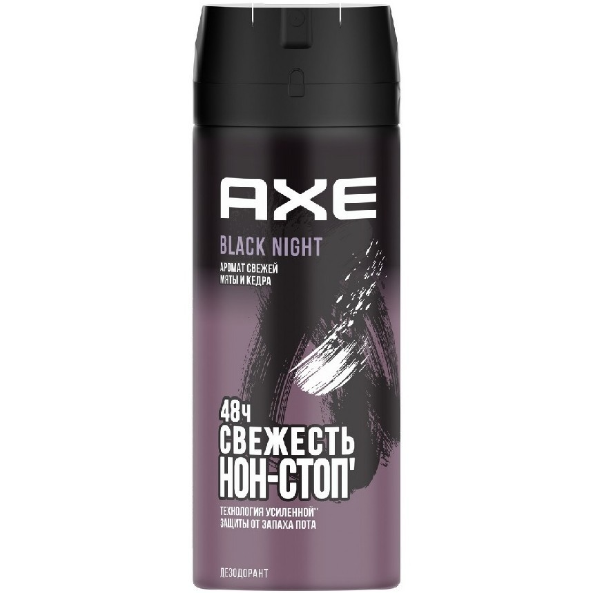 Не оставляет следов и пятен на одежде и не блокирует потовые железы, придавая уверенность в себе‚ на весь день, каждый день и в любой ситуации. Стань героем в ее глазах с АХЕ BLACK NIGHT!АХЕ – самый популярный мужской бренд в мире, знаменитый своими эксклюзивными ароматами и удивительными рекламными кампаниями. Каждый аромат АХЕ – это произведение искусства, созданное при участии легендарного парфюмера Энн Готлиб.В ассортименте бренда представлены все самые популярные форматы, существующие на рынке дезодорантов.Тем, кто ценит лучшие ароматы, АХЕ предлагает свои классические дезодоранты-спрей, разработанные при участи лучших парфюмерных домов мира. Аэрозоль Dark Temptation уже несколько лет является абсолютным бестселлером на рынке мужских дезодорантов. В 2018 году АХЕ запустил новый продукт – карандаши-дезодоранты в черных упаковках, которые повторяют три аромата бестселлера АХЕ Dark Temptation, Dark и Anarchy. Дезодоранты‚ AXE имеют антибактериальную формулу и препятствуют появлению неприятного запаха, но в то же время не содержат солей алюминия. Для тех, кто ценит практичность и надежную защиту от пота и запаха на весь день АХЕ представляет антиперспиранты в трех форматах: аэрозоля, стика и ролика. Все антиперспиранты бренда АХЕ легко отличить: вне зависимости от формата они белого цвета. Антиперспиранты-аэрозоли, карандаши и ролики серии АХЕ Signature созданы специально для мужчин, которые помимо своего аромата ценят и свой гардероб — помимо защиты от пота и запаха они не оставляют белых следов и желтых пятен на одежде.