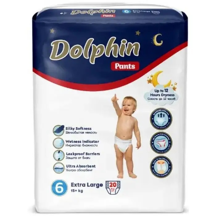 Подарите своему малышу комфорт с новыми трусиками Dolphin Pants. Легко одеваются как обычные трусики и удобно снимаются, для этого просто нужно разорвать боковинки и свернуть трусики, используя липучку утилизатор. Индикатор влажности поможет определить степень наполненности трусиков. Трусики Dolphin Pants обеспечивают комфорт и защиту от протеканий 12 часов, сохраняя кожу малыша сухую всю ночь. Дышащая область талии не создают эффекта сауны и позволяют коже малыша дышать. Технология эластичной талии на 360 градусов фиксируют талию, позволяя активно двигаться вашему малышу.