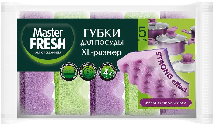 Губки для мытья посуды Master Fresh XL Strong effect 95х65х35мм 5шт – незаменимые помощницы, благодаря которым ваша посуда засияет чистотой! Губки изготовлены из поролона повышенной плотности и сверхпрочной фибры. Они легко и деликатно справляются с различными загрязнениями, не деформируются и не крошатся при долгом взаимодействии с водой. Качественная рельефная поверхность обеспечивает обильное пенообразование, позволяя сэкономить моющее средство. В упаковке 5 штук. Изделия имеют увеличенный размер: 95х65х35мм. Миссия производителя продукции торговой марки «Master Fresh»: изготовление и продвижение качественных и доступных товаров повседневного спроса, делающих жизнь потребителей проще и легче.